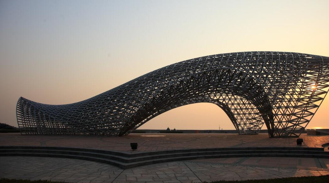 南汇嘴观海公园公园占地1.82公顷,位于上海陆缘最东南面。整个公园的标志性雕塑是由不锈钢管构成的双层网架结构、总用钢量约120吨的“司南鱼”(指南针)。公园在吹沙填海滩涂上新建而成,是体现湿地土地后备资源功能和近海海岸湿地景观纪念性公园。南汇新城一线海塘已全部达到防御200年一遇高潮位及12级以上强台风的标准。南汇嘴观海公园占地1.82公顷,位于浦东新区南汇新城,长江口外南岸、杭州湾北岸沙嘴,是在吹沙填海滩涂上新建而成。“”南汇”一名来源于长江出海后受海潮顶托折旋而南,与钱塘江水在此交汇成陆,故此地称之为南汇,因沙嘴向南契入长江口与杭州湾交汇处,故名南汇嘴,又称南汇角,曾称老鹳嘴。南汇嘴观海公园的标志性雕塑是由不锈钢管构成的双层网架结构、总用钢量约120吨的“司南鱼”。该雕塑长48.8m, 宽21.45m 高13m ,以寓意改革、开放、交流和中华民族为人类航海事业发展所作的伟大贡献。