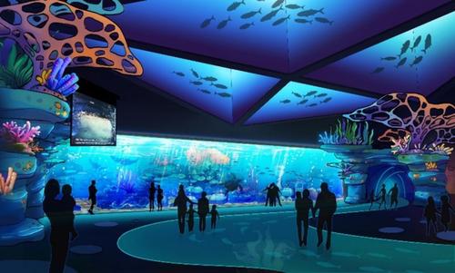 水族馆共分5层,总建筑面积22,600平方米,拥有9大展示区域,32个主题展缸,展示 了来自五大洲四大洋的350多个品种,10000余条水生物及珍稀鱼种。馆内最有特色的展示是叶海龙、草海龙、锯鳐、水母、沙虎鲨、企鹅、斑海豹等珍稀海水、淡水品种,其中沙虎鲨数量为中国水族馆之最。