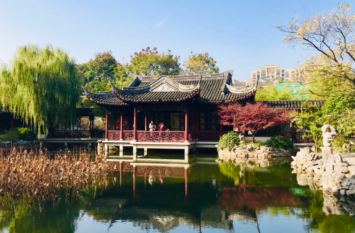 四、古漪园古漪园红色叶植物与周边建筑、山石、水体完美结合、相得益彰,呈现出浓浓的古典美。在古猗园缺角亭下,层层片片的红枫如同火红的晚霞高低错落漂浮于小山坡上。“最美厕所”前的一整片银杏林是难得的佳景,与万安塔、湖面、青清园门洞相搭配,宛若一幅美丽的画面。