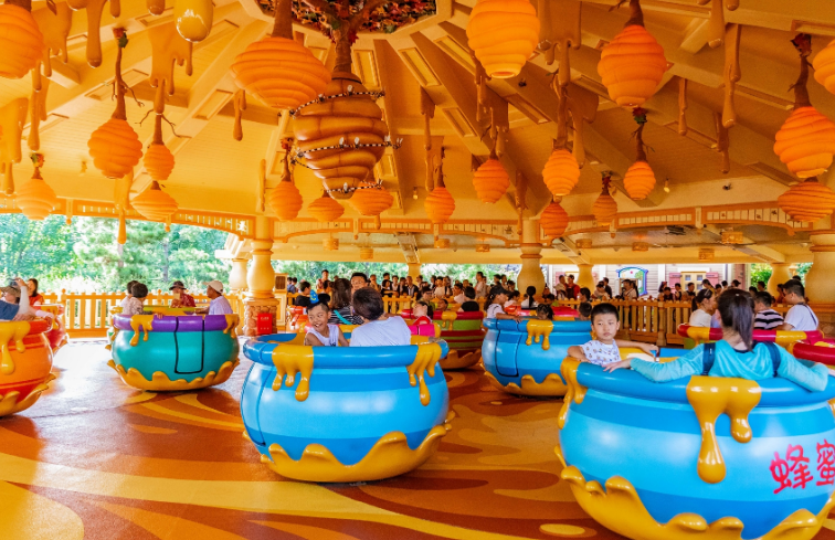 三、旋转疯蜜罐维尼喜欢以自己的方式在装满蜂蜜的陶罐上标注“疯蜜”。在捆扎着蜂巢的篷顶下,热情的蜜蜂们在身边哼唱着小熊维尼之歌。通过转动蜜罐中心的方向盘,自由地控制蜜罐的旋转速度。蜜罐上的各处细节,包括双语标签都用心设计。