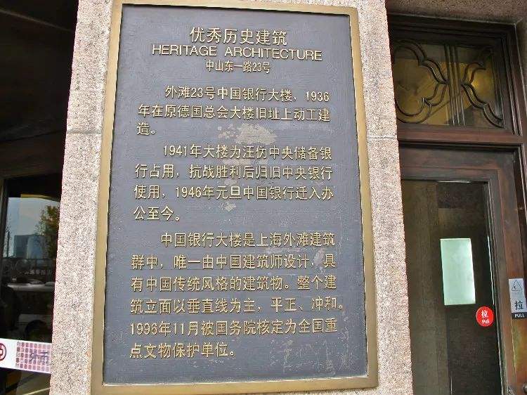 中国银行大楼,外滩的建筑素以欧洲风格见长,而中国银行大楼是为数不多的具有中国民族特色的建筑之一。大楼分为主楼和次楼。外墙为金山石,屋顶为平缓的四方攒尖顶,上盖绿色琉璃瓦,楼檐上用斗拱装饰。东立面从高到低有变形的钱币形镂空窗框。大门上方原有孔子周游列国石雕讲述了一个个令人神往的故事。营业大厅的天花板上原来还雕有“八仙过海”的图案。到处洋溢着古色古香的氛围。这些雕梁画栋、碧瓦飞檐同时也是中华民族智慧与勤劳的结晶,让后人得以继承和发扬。