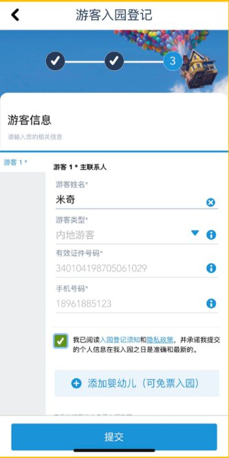 5、去人您的游客信息,点击“提交”完成预约