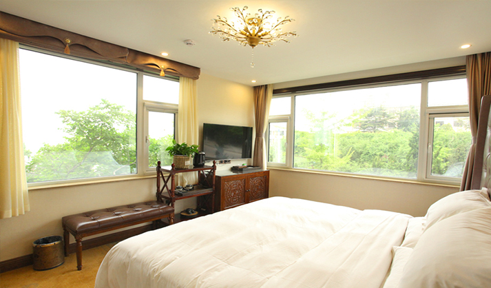 长岛庭园立志打造温暖之家。房间设计比较简朴大气,舒适的大床旁铺了纯白的床幔,床头柜上放着清香的百合花,花香四溢,暖风将透明的纱幔吹的飘飘如尘。