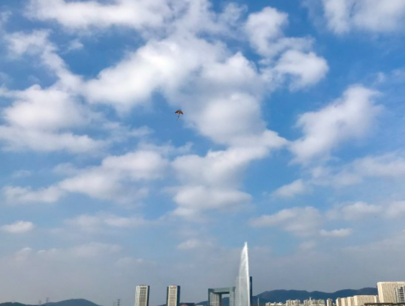 穿过东海路,就来到五四广场南区的滨海公园。沿广场中轴线自北向南依次排列着可进行露天演出的下沉式广场、旱地点阵喷泉和雕塑“五月的风”。露天广场由半圆形四级观众看台和圆形露天舞台组成,舞台下的地下室是五四广场的办公室和总控制室。每当节假日及重大活动时,露天舞台上会举行各种演出。