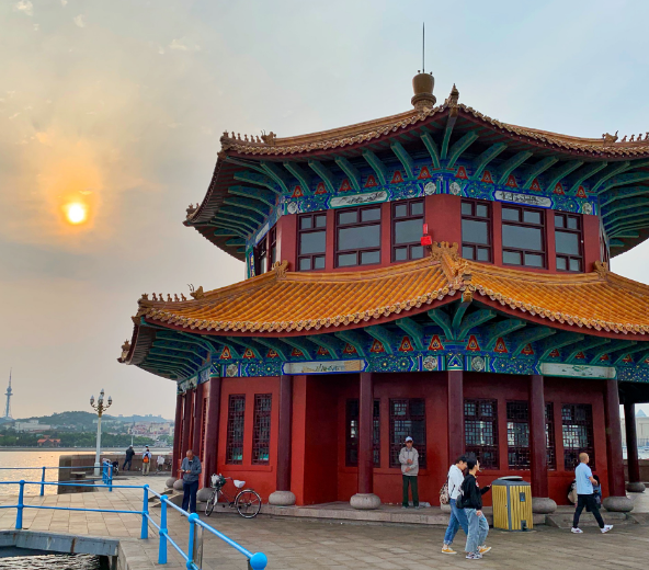 五米,回澜阁是一个两楼的小亭子,位于栈桥的尽头,1892年,清政府青岛驻军在此搭起了一座铁木结构、以木铺面的栈桥,长约200米,专供装卸军用物资之用。