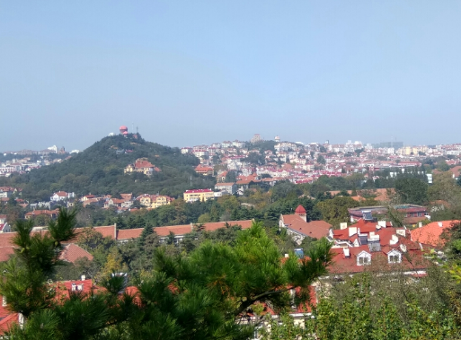 小鱼山的大门抬阶而上,看到的一个亭子是一个挑檐式的六角亭,在亭内可以把碧波荡漾的汇泉湾一览无余,故得名“碧波亭”。“碧波亭”的匾额“碧波”二字是由著名的国画艺术大师吴作人手书的。大家看远处的山上有三栋红色蘑菇楼宛如三柄熊熊燃烧的火炬,那是青岛市十大山头公园之一的信号山公园。在半山腰绿树丛中的那栋别具特色的建筑是青岛市迎宾馆,原是“德国总督府官邸”。我们再由“碧波亭”拾阶而上,站护栏边可以看到右下边有两幢民族式建筑,一座形如城楼,一座貌似宫殿,那就是青岛市海产博物馆。