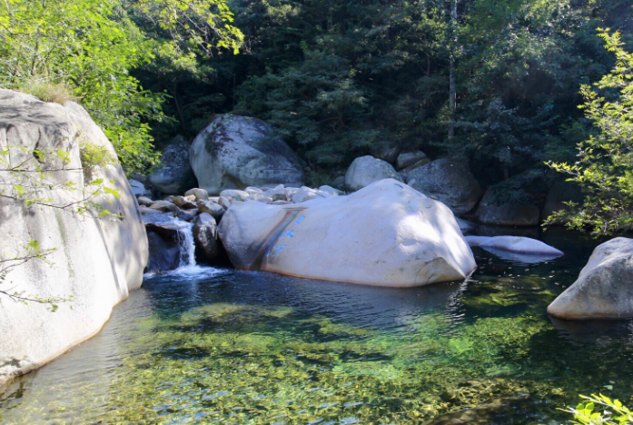 北九水在山东崂山白沙河上游。白沙河源出山顶北麓,河水经山脚而折流,有九折;人行河畔小路,转折处须涉水而过,亦九涉;每涉一次为一水,故称九水。