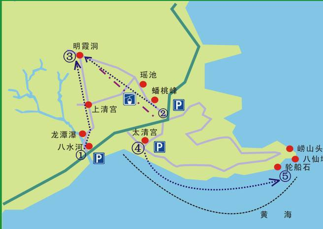 八水河区域为爬山线路,沿八水河而上,观龙潭瀑水库,游千年上清宫,沿曲弯小径穿林登山,能到达的终点为崂山著名道观:明霞洞,如线路①至③,整个路程需时1至1个半小时。感觉较累的朋友可选择爬到龙潭瀑或上清宫后原路返回,爬到此处需时约为40分钟。另外也可选择乘坐太清索道直达明霞洞,如线路②至③。
