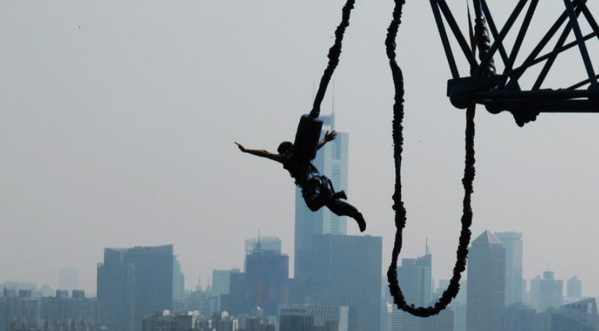 济南的锦云川乐园是从上往下跳的。按弹跳方式分为三种:桥梁蹦极、高空蹦极、火箭蹦极。乐园的高空蹦极塔高45米,距水面高度50米,弹跳高度38米,号称“齐鲁第一蹦”;火箭蹦极就是欧式蹦极,架高12米,上弹高度可达13米。