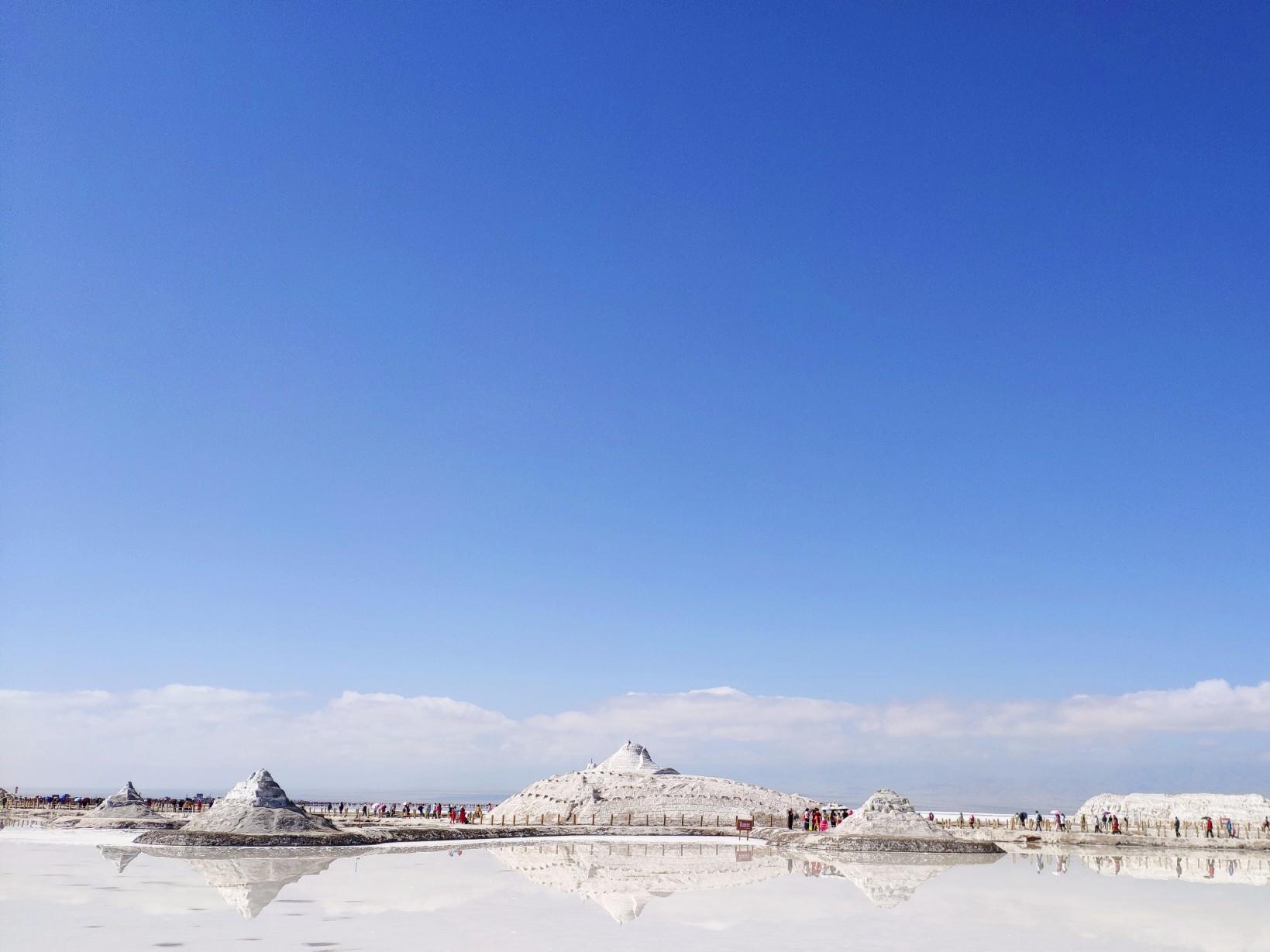 茶卡盐湖是一座有三千多年历史的盐场,湖水含盐量很大,会自然结晶成为一片白色的湖面,将天空、云朵和对岸的山都倒映在湖里,景色非常漂亮。游客还可以赤脚走到湖面上观看和拍摄自己的倒影,犹如天空之境。