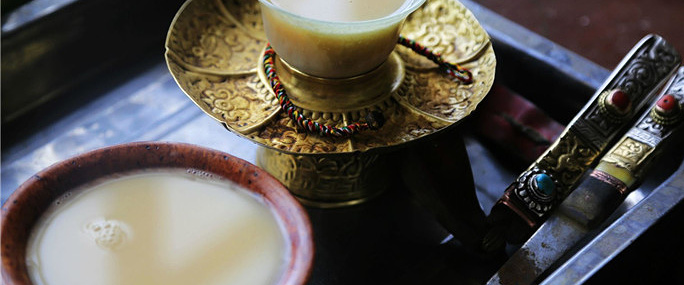 酥油茶是藏族的特色饮料。多作为主食与糌粑一起食用,有御寒提神醒脑、生津止渴的作用。此种饮料用酥油和浓茶加工而成。先将适量酥油放入特制的桶中,佐以食盐,再注入熬煮的浓茶汁,用木柄反复捣拌,使酥油与茶汁溶为一体,呈乳状即成。与藏族毗邻的一些民族,亦有饮用酥油茶的习俗。