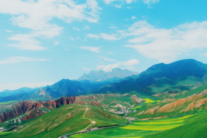 祁连 大草原最佳的观赏时节是在每年的7-9月份。那时草原上成片成片的绿连绵不绝通向远处的褐色山体—— 祁连山脉,而山体上终年不化的积雪,成为了美丽景象的背景。鬼斧神工的大自然是最厉害的画师,随意搭配的色彩,就意味着勃勃生机。