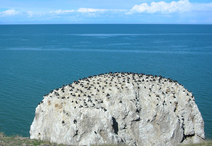 一、海心山海心山位于青海湖中心略偏南,距鸟岛约25公里。岛形长,中部宽而两端窄,长2.3公里,宽0.8公里,面积1.14平方公里。岛上最高点海拔3266米,由花岗岩、片麻岩组成;岛东缘有一泉眼,可供饮用。南部边缘岩石裸露形成陡崖,东、西、北为平缓滩地。