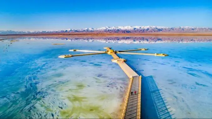 茶卡盐湖夹在祁连山支脉完颜通布山和昆仑山支脉旺尕秀山之间,两山常年积雪,雪山倒影在湖面,形成“湖水与长天一色,盐湖与雪峰同辉”壮美的青藏高原独特自然风光。