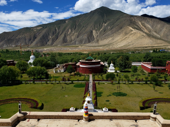 三、雕像浮雕沿古道上行到一个平台,正中是高达9米的文成公主雕像。贵族装束的公主身着披风,怀抱宝镜,坚定地目视前方。她的背后,是一组再现她进藏故事的青铜浮雕。浮雕长20米,宽6米,分为三个部分:第一部分是古都送别、第二部分叫赤岭摔镜、第三部分是藏王迎亲。