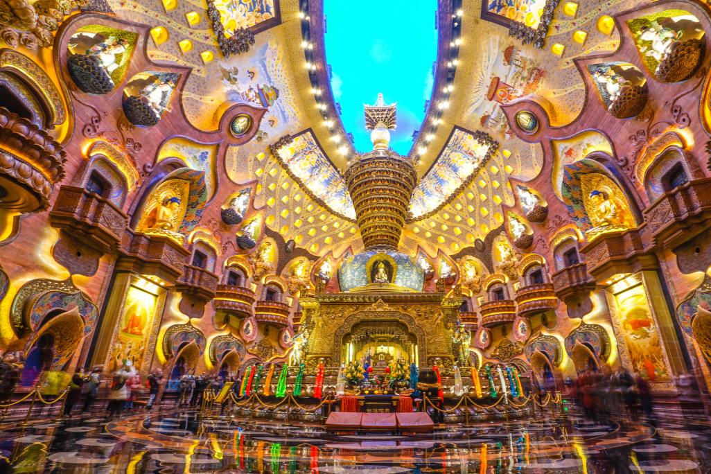 佛顶宫总建筑面积近10万平方米,主体建筑共9层,地下利用矿坑建设了6层,规模宏大,可以说在世界上的佛教建筑中也是少见的,而这里就是安放和供奉佛顶舍利的地方。佛顶宫呈半圆状,整体造型是以巨型莲花托起佛顶发髻的摩尼穹顶,直径超过200米,非常辉煌壮观。