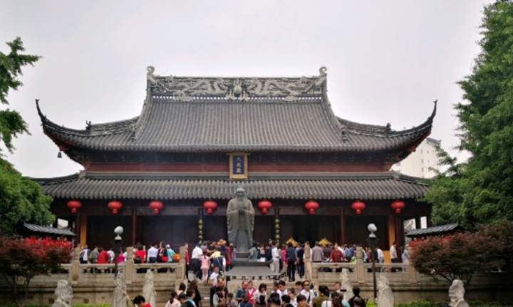 大成殿是夫子庙的主殿,高16.22米,阔28.1米,深21.7米。殿内正中悬挂一幅全国最大的孔子画像,高6.50米、宽3.15米。殿内陈设仿制2500年前的编钟、编磬等十五种古代祭孔乐器,定期进行古曲、雅乐演奏,演出反映明人祭孔礼仪的大型明代祭孔乐舞,使观众听到春秋时代的钟鼓之乐、琴瑟之声,展现二千多年前另古乐风貌。