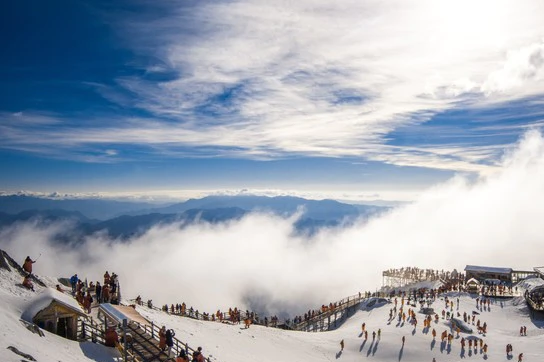 玉龙雪山是纳西人心中的神山,主峰扇子陡海拔5596米,常年在云雾缠绕之中,是一座未被征服的处女峰。由12座雪峰组成,雪山自然旅游资源丰富,可分为雪域、冰川、高山草甸、原始森林景观等。雪山气势磅礴,玲珑秀丽,随着时令的变化,在不同高度依次开放的杜鹃花组成了雪山最美的风景。