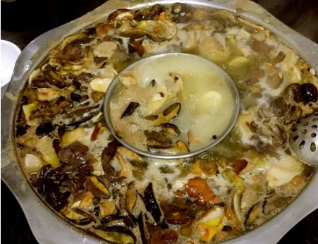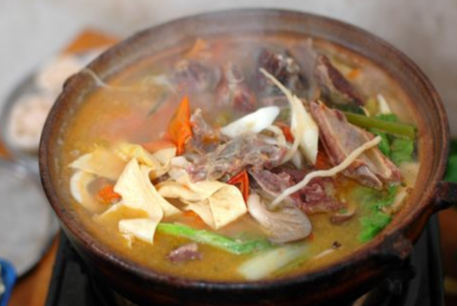 腊排骨火锅是纳西名菜“三叠水”第三叠——热烈叠中不可或缺的一道主菜。三叠水,纳西人的满汉全席,丽江人称之为“雪山宴”。 只有宴请贵宾才上此菜。食用时常采用沙钵,佐 以芋头、山药、韭菜根、青笋、莲藕等辅料,文火炖开,汤色醇白鲜美、肉质细嫩。