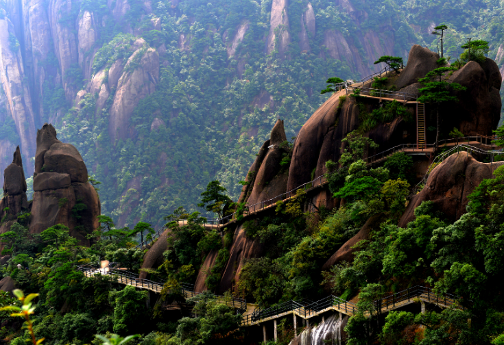 三清山的山势是东、南、西三面陡峻,北面平缓,地势高差很大。从整体看,东坡从金沙至玉京峰,西坡从横坦、汾水至玉京峰,恰为两个相靠的凹球面,它们与南部的凸球面合成高耸入云、层峦叠峰的奇特地貌。东坡比西坡平缓,南坡又比东坡平缓。组成三清山主体的岩石为燕山晚期花岗岩,其中边缘相和过渡相的花岗岩是构成三清山峰峦的主要岩石,近谷底则多为内部相的中粗粒斑状、似斑状黑云母花岗岩,因其极易风化剥蚀,故多形成稍缓地形。