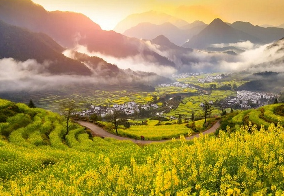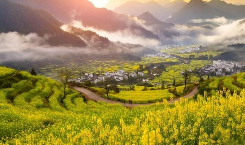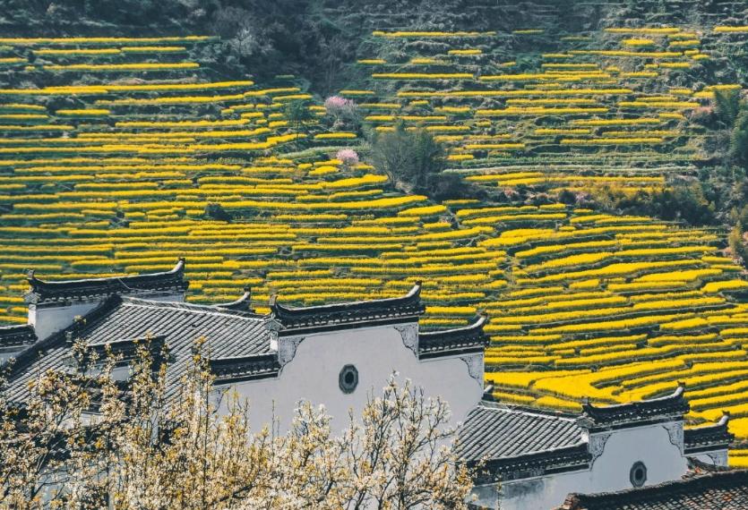 江岭的百亩油菜花海绝对是婺源的头牌;当百亩油菜花海盛开的时候,漫山遍野金灿灿的一片;随着梯田的变化而呈现阶梯状的分布,丘陵层叠,流水潺潺;白墙灰瓦的徽派村落错落有致地散落在花海之间。