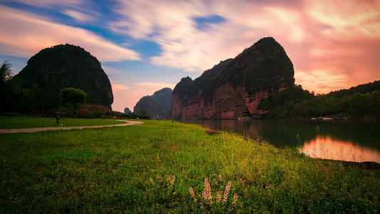 湖虽不大,但船会带你在湖上逛一大圈才在对面靠岸。在湖心可回望整个龟峰景区,挺拔错落的山体倒映在湖面,天气好的时候阳光照射在山峰上,使得山色红艳,异常迷人。靠岸后,沿着林间一条水泥路前行,不久就到了骆驼峰山脚。