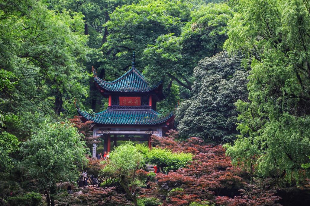 爱晚亭位于岳麓书院后青枫峡的小山上,八柱重檐,顶部覆盖绿色琉璃瓦,攒尖宝顶,内柱为红色木柱,外柱为花岗石方柱,天花彩绘藻井,蔚为壮观。清乾隆五十七年(公元一七九二年)山长罗典所建。原名“红叶亭”,又名“爱枫亭”。后据唐代诗人杜牧《山行》而改名为爱晚亭,取“停车坐爱枫林晚,霜叶红于二月花”之诗意。