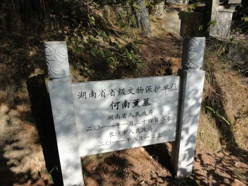 何南熏墓位于宁乡县沙田乡长冲村勺子冲马里山,距省级文物保护单位、党一大代表何叔衡故居仅150米,西距沙田乡政府约3公里,涓水河顺山谷流入沩水,交通便利。何南熏墓时代为民国(1922年),墓周围栽种杉、樟林树木、配以低矮植物,环境优美,墓占地面积约为180平方米。依山势坐东朝西。前为农田,后靠山顶。由平台、拜台、墓主体三大部分组成。平台前为深坑,平台两侧立有石人2尊、石马2尊(1尊修复)、石狮2尊、华表2个等雕刻;拜台前有香炉,墓直径为5米,麻石结构,墓冢为平顶。墓围庐用麻石砌成。下面为双层“山”字型结构,墓祁阳石碑上横刻有孙中山题词为“为国捐躯”和直书“南薰司令千古”。墓联石刻对连:顽糜儒立志决身纤。墓围麻石雕刻龙、象及花草等精美12个纹饰。整个墓葬保存完好,气魄宏伟,庄严肃穆。