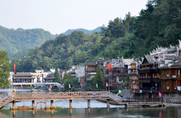 凤凰古城分为新旧两个城区,老城依山傍水,清浅的沱江穿城而过,红色砂岩砌成的城墙伫立在岸边,南华山衬着古老的城楼,城楼还是清朝年间的,锈迹斑斑的铁门。凤凰古城北门城楼本名“璧辉门”,北城门下宽宽的河面上横着一条窄窄的木桥,以石为墩,两人对面都要侧身而过,曾是出城的唯一通道。