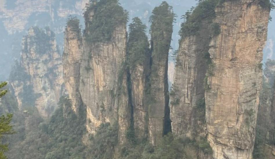 袁家界后花园内石峰千姿百态,溪水绕峰而流;山上古木参天,云雾弥漫,犹如古时皇宫内的后花园一样。