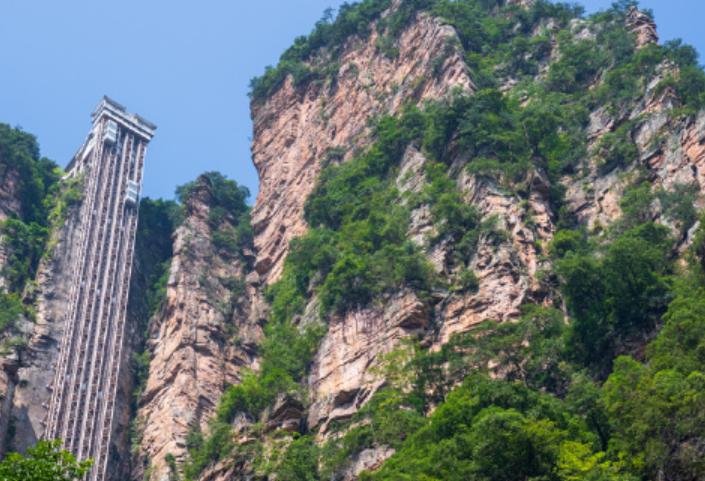 百龙天梯气势恢弘,垂直高差335米,运行高度326米,由154米的山体内竖井和l72米的贴山钢结构井架组成,采用三台双层全暴露观光并列分体运行。