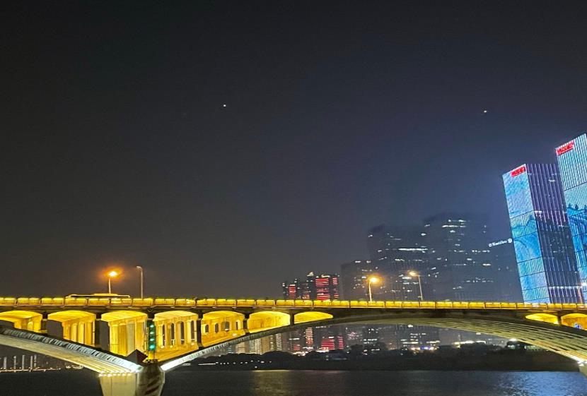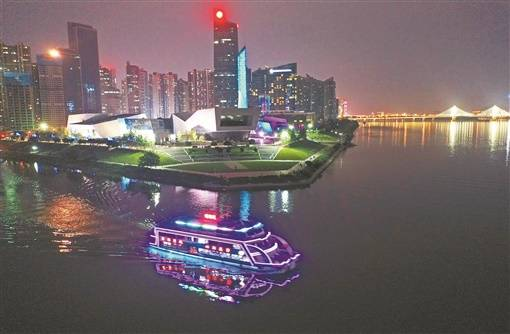 夜游湘江坐在游轮上,可以看看夜色中的橘子洲头,看看长沙的夜景,灯火辉煌映照下湘江的美景。站在船头甲板上,抬头望去,广幕的夜空繁星点点,与闪灯风筝辉映成趣。往西边看去,岳簏山象天边一大片黑云,什么也看不见。橘子洲的灯光倒影在江中,给人梦幻感觉。东岸的杜甫江阁在黑夜里发出历史的光芒。