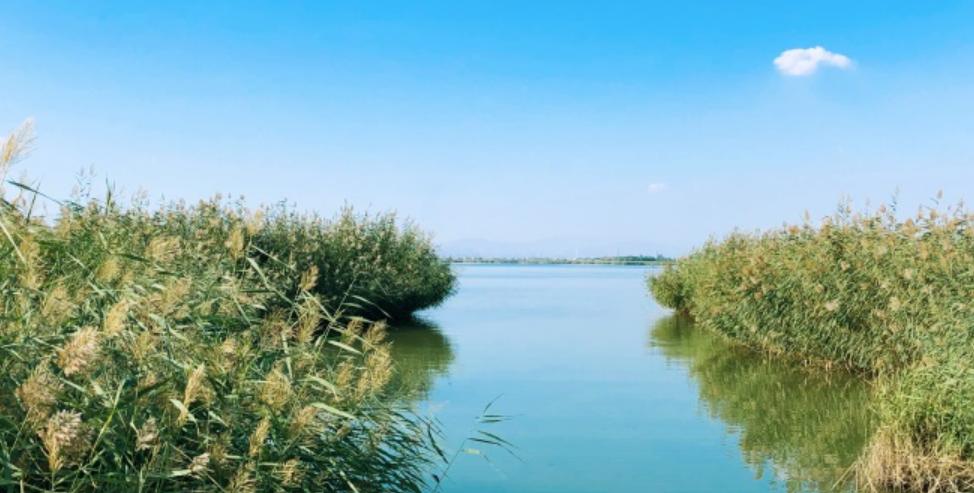 簇簇葱郁的芦苇,倒映在水里,挤挤挨挨,清丽可人,仿若伊人在水一方。碧水、蓝天、飞鸟、簇苇,这样美的画卷,有人静静的醉着,有人轻轻叹着,有人举起相机,将美丽瞬间变为永恒。