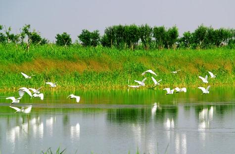 2、碧沙宿鹭:这里有大片的水面和陆地岛屿,从平面上看,形状胜似一只白鹭站立在水面上觅食。
