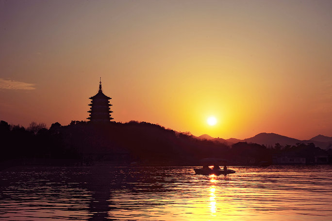 雷峰塔。每到黄昏,夕阳笼罩,塔影横斜,傲立余晖,满湖金波,“雷峰夕照”就此得名。