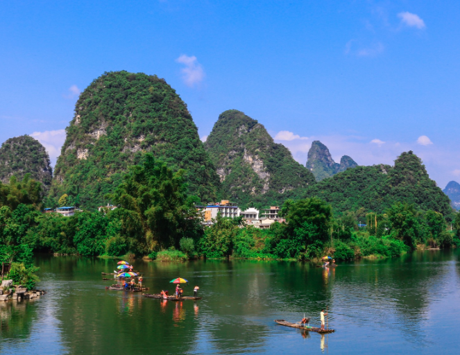 一、漓江“江作青罗带,山如碧玉簪”,以漓江风光和溶洞为代表的山水景观有山青、水秀、洞奇、石美“四绝”之誉。从桂林至阳朔的83公里漓江河段,也称漓江精华 游,还有“深潭、险滩、流泉、飞瀑”的佳景,是岩溶地形发育典型、丰富和集中地带,集中了桂林山水的精华,令人有“船在水中游,人在画中游”之感。漓江是世界上风光最秀丽的河流之一,长160公里。漓江两岸的山峰伟岸挺拔,形态万千,石峰上多长有茸茸的灌木和小花,远远看去,若美女身上的衣衫。江岸的堤坝上,终年碧绿的凤尾竹,似少女的裙裾,随风摇曳,婀娜多姿。最可爱是山峰倒影,几分朦胧,几分清晰。江面渔舟几点,红帆数页,从山峰倒影的画面上流过,真有“船在青山顶上行”的意境。