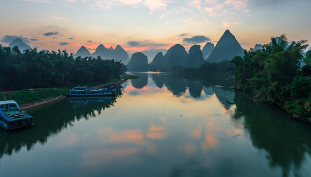 漓江阳朔段两岸是世界上最典型的岩溶峰林地貌,也是广西最美丽的河段。从近阳朔县境的潜经村开始,漓江进入峡谷地段,蜿蜒予丛山之中,河谷深切400米。漓江不但河谷深,且河床比降大,平均为千分之四,形成许多滩、洲、峡、矶。