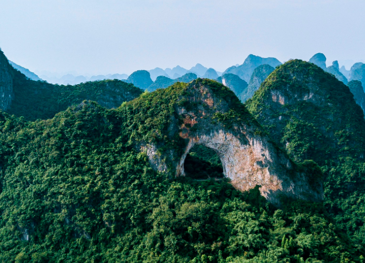 三、月亮山月亮山位于位于广西壮族自治区桂林市阳朔县十里画廊景区末端。山头上有一个天然的大石拱,两面贯通,远看酷似天上明月高挂。从不同的角度变换观看,此洞形状也不断变化。如果是开着车赏月山,那个石拱的形状会从弯弯的上弦月,逐渐变成半月、圆月 ,继而又变成下弦月。