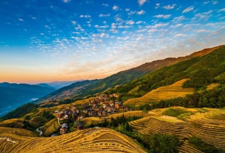 位于龙脊梯田景区内的大寨村,这里是红衣瑶族的村寨,因此又叫大寨红瑶梯田。相比龙脊的平安壮族梯田和龙脊古壮寨,金坑梯田更为原生态,梯田景观也更为辽阔和壮美,这里拥有的日出与日落的观景点。