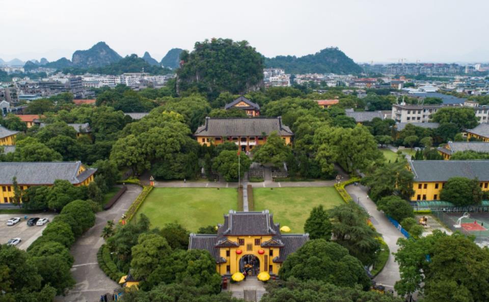 独秀峰位于广西桂林市中心的靖江王城内,它是王城景区不可分割的部分。孤峰突起,陡峭高峻,气势雄伟,素有“南天一柱”之称。登上独秀峰可环望四处城区景色,而山上的一些古今名人石刻也是看点,尤其是名扬四海的名句“桂林山水甲天下”,就是出自独秀峰山脚的石刻之上。
