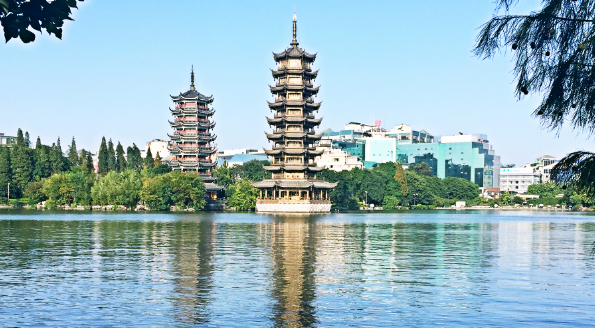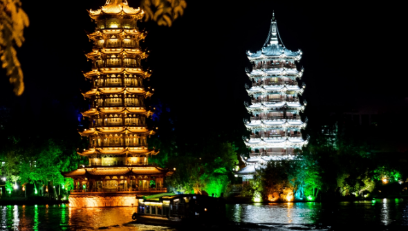日月双塔是两江四湖环城水系中最著名的旅游景点,因为与桂海碑林中的宋代雕刻日月神菩萨隔河相对,又因为双塔高耸入云,直指日月,故名日塔、月塔。两座塔均为楼阁式山水塔。