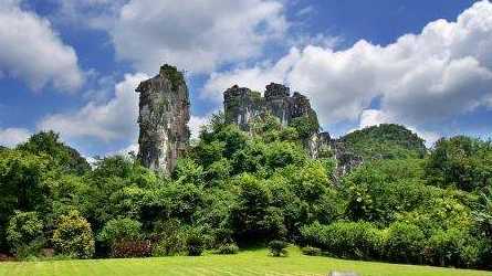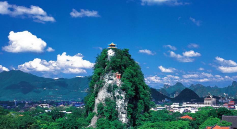 独秀峰又称紫舍山,孤峰似披紫袍金衣位于广西桂林市区中心靖江王城内,有“南天一柱”之称。山东麓的颜延元读书岩是桂林最古老的名人胜迹。