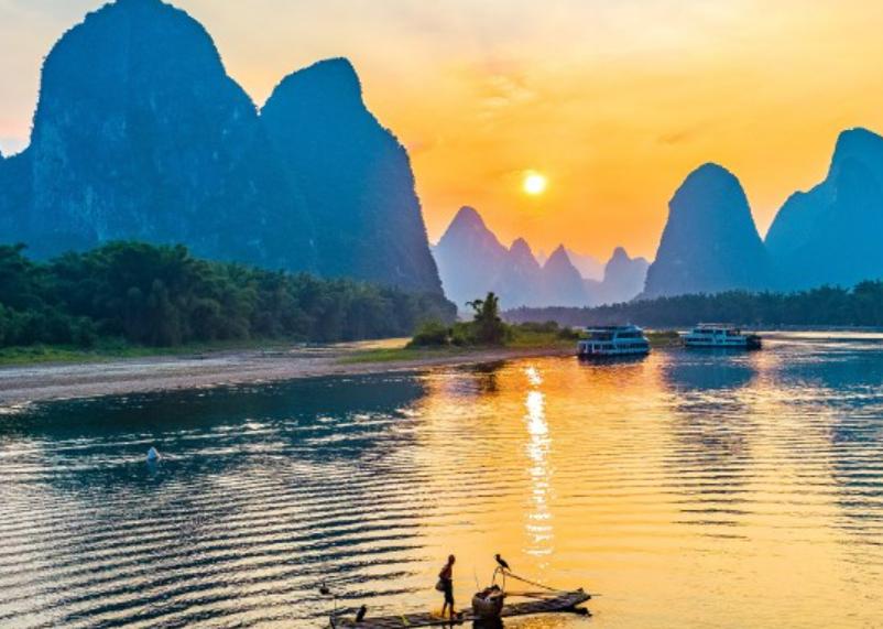 桂林漓江风景区是国家5A级旅游景区,是世界上规模最大、风景最美的岩溶山水游览区,千百年来它不知陶醉了多少文人墨客。正如著名文学家韩愈的诗句所言:江作青罗带,山如碧玉簪。以漓江风光和溶洞为代表的山水景观有“山青、水秀、洞奇、石美”四绝之誉。