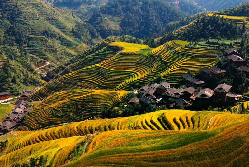 而到了9月-10月的时候,龙脊梯田进入丰收期,梯田的颜色由浓绿色变为金黄色,整体看起来更加的壮观。