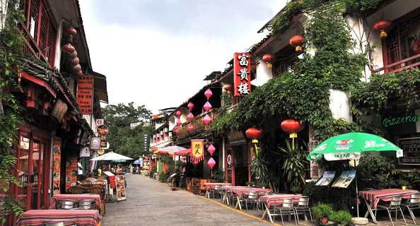 阳朔西街又被戏称洋人街,已有1400多年的历史。西街至今仍是小家碧玉型的南方村镇建筑规模,但却显现着国际情调的人文景观。这里的酒吧、饭店、网吧、工艺品书画店等装修风格大多中西合璧。