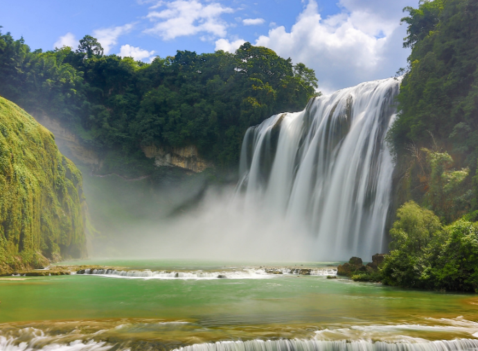 一、黄果树大瀑布黄果树瀑布风景区位于贵州省镇宁、关岭两县境内北盘江支流、打帮河上游的白水河和坝陵河上。景区以黄果树大瀑布为中心,以瀑布、溶洞、地下湖为主体,素有“天下奇景”之称。黄果树大瀑布是中国第一大瀑布,也是世界最阔大壮观的瀑布之一。 瀑布后的水帘洞相当绝妙,134米长的洞内有6个洞窗,5个洞厅,3个洞泉和1个洞内瀑布。游人穿行于洞中,可在洞窗内观看洞外飞流直下的瀑布;每当日薄西山,凭窗眺望,犀牛潭里彩虹镣绕,云蒸霞蔚,苍山顶上绯红一片,迷离变幻,这便是著名的“水帘洞内观日落”。位于黄果树瀑布下游8千米处的天星景区由地下河塌陷形成。宽约300米的“天生桥”,上下奇峰壁立,瀑布飞泻,有旱石林、水上石林等奇特景观,秃石上长满了巨大的仙人掌。
