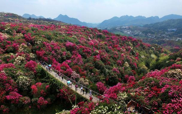 百里杜鹃位于贵州省西北部、毕节市中部,隶属毕节市百里杜鹃管理区,总面积125.8平方公里。因天然原始林带宽1~3千米,绵延50余千米而得名,是国家级森林公园,2013年成功晋升为5A级景区。景区内的景点有5个:1、红军广场,2、健生道,3、古道遗迹,4、祭祀花神主题园,5、卷洞门水库。