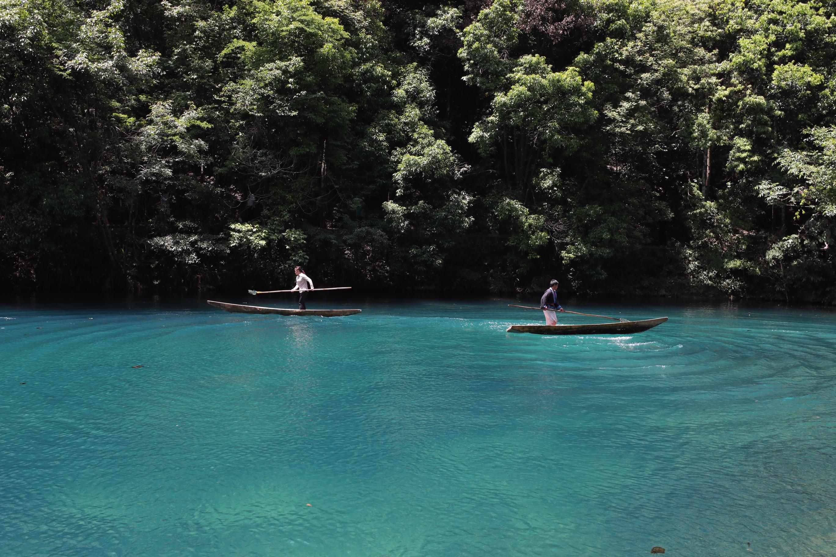 二、鸳鸯湖鸳鸯湖是小七孔一奇景,湖水如油,碧绿而凝重。因湖中有两棵并排参天的大树而得名,这两颗大树半截在水中,枝叶则在上方交握,雌树纤巧秀丽,雄树则两三人才能环抱过来,雄壮挺拔。湖面幽静,水道四通八达,不小心还会迷路,不过湖中经常会有领路的船只行走,一旦迷路只需静静等待救援即可。