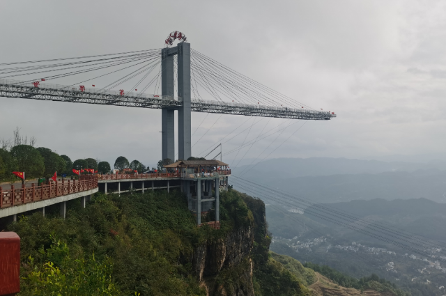 二、渡仙桥渡仙桥建设在悬崖峭壁的险峻山体之间,山体之间玻璃桥长达420米,离地垂直高520米。站在桥上,一半云里,一半雾里,给人一种虚幻缥缈的感觉。