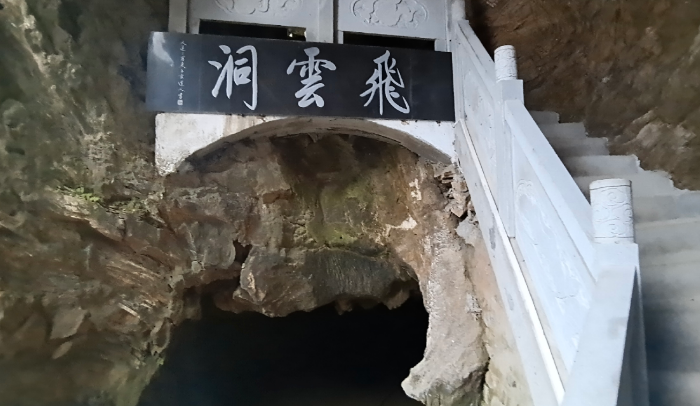 游客从一龙戏九珠景点拾级登攀去野猪林,须穿过一溶洞;洞顶石壁多浅凹,经洞口光线照射,宛如片片鳞云乱飞,故名飞云洞。